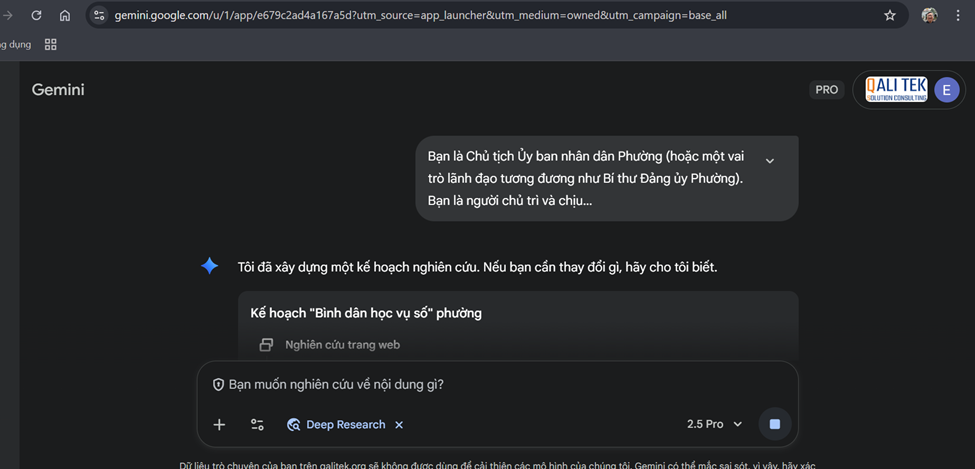 - Làm giàu dữ liệu: Khi sử dụng “Deep Research” , Gemini tự động tìm kiếm và bổ sung các căn cứ pháp lý cấp cao hơn (như Quyết định 749/QĐ-TTg của Thủ tướng ), làm cho kế hoạch chặt chẽ và có tính pháp lý cao hơn.