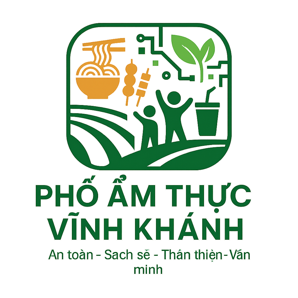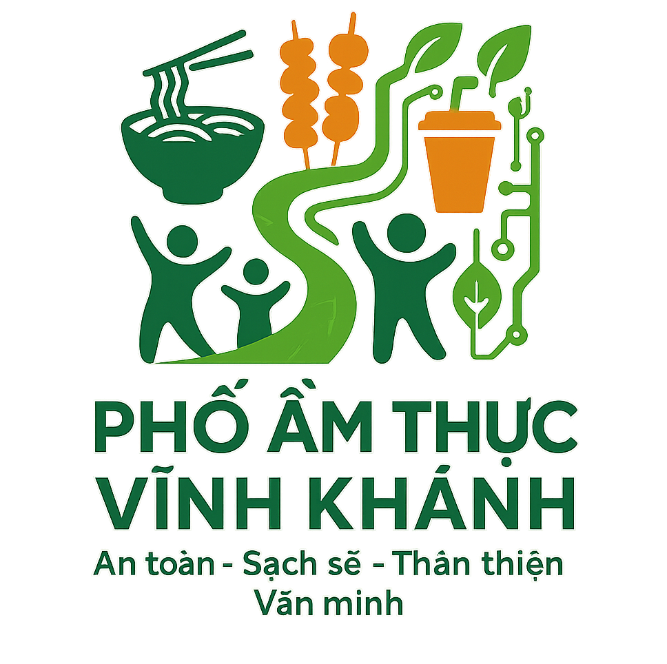 Design a professional vector logo for “Phố Ẩm Thực Vĩnh Khánh” – a modern, smart food street destination powered by green technology (4.0). The logo should convey a vibrant, clean, friendly, and civilized atmosphere. Include the slogan at the bottom: “An toàn – Sạch sẽ – Thân thiện – Văn minh”.